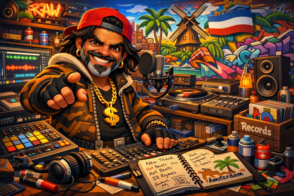 Randy Daha is a multidisciplinary creative based in Amsterdam, with roots in Suriname and a practice shaped by music, image-making, rhythm, memory, and street culture. His work moves between sound and visual identity, drawing energy from hip-hop, graffiti, studio culture, and the raw poetry of everyday city life.